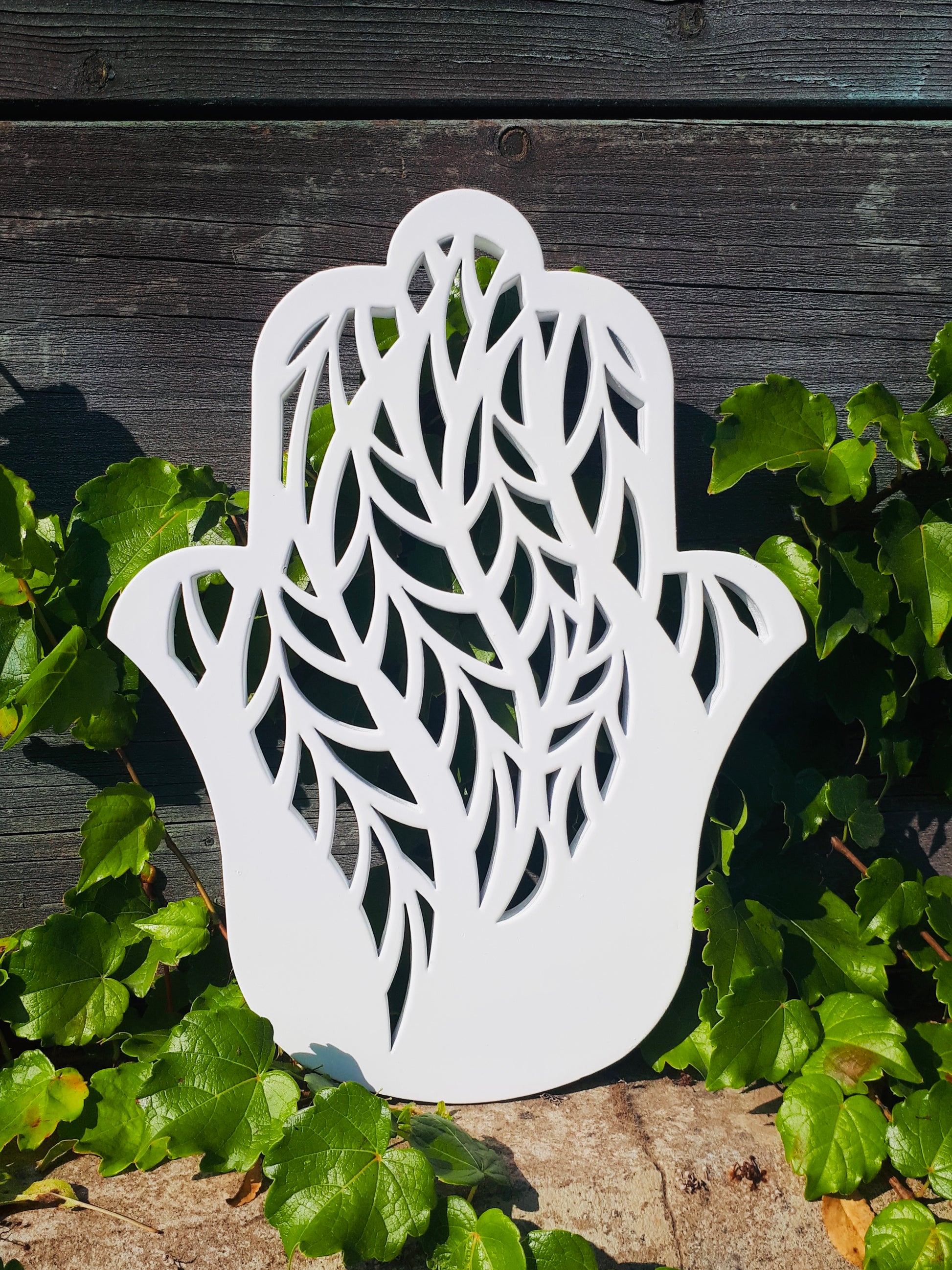 Add purity, peace, and elegance to your space with this handcrafted White Hamsa Wall Art featuring a graceful leaves design. Created in Israel with precision laser-cut metal, it brings timeless symbolism and contemporary beauty into your home.
